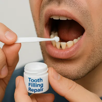 پاسخ: برخی خمیرهای موقت موجود در داروخانه مانند Dental Repair Kits برای استفاده اضطراری توصیه میشوند. این خمیرها نباید بیش از چند روز استفاده شوند و جایگزین ترمیم حرفهای نیستند.